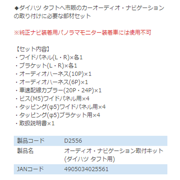 Original Japanese name: | エーモン オーディオ ナビゲーション取り付けキット D2556 ダイハツ タフト ※ LA900S LA910S カーオーディオ カーナビ 取付キット |