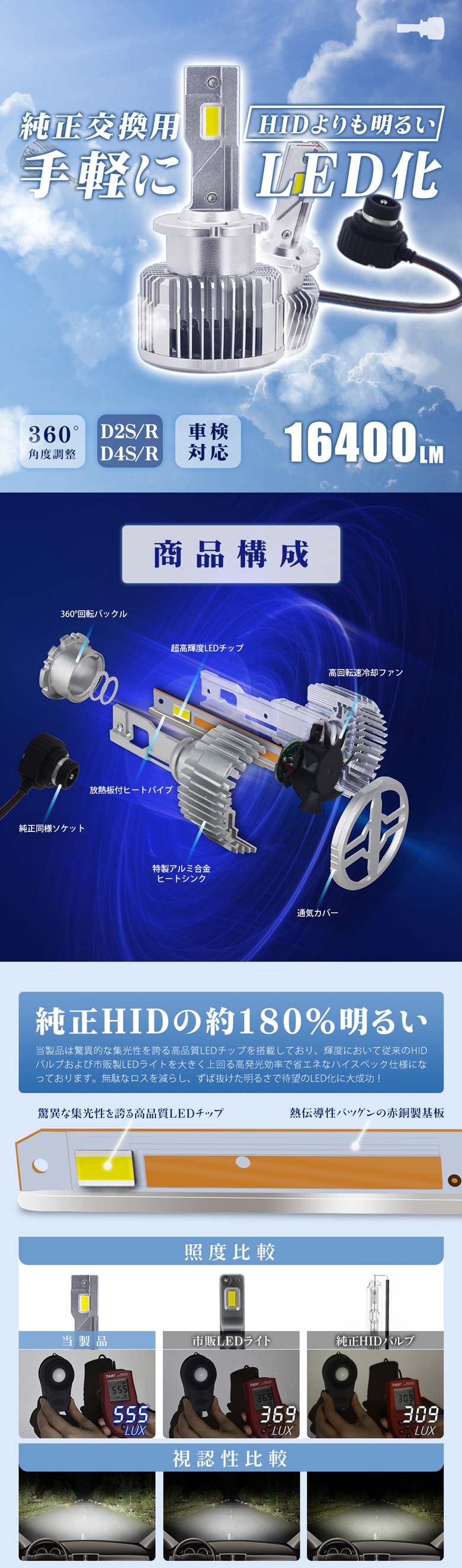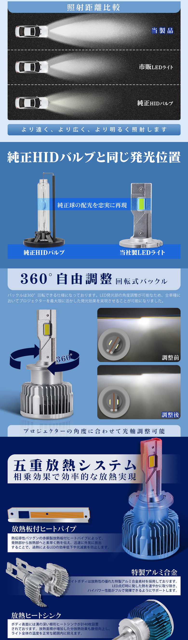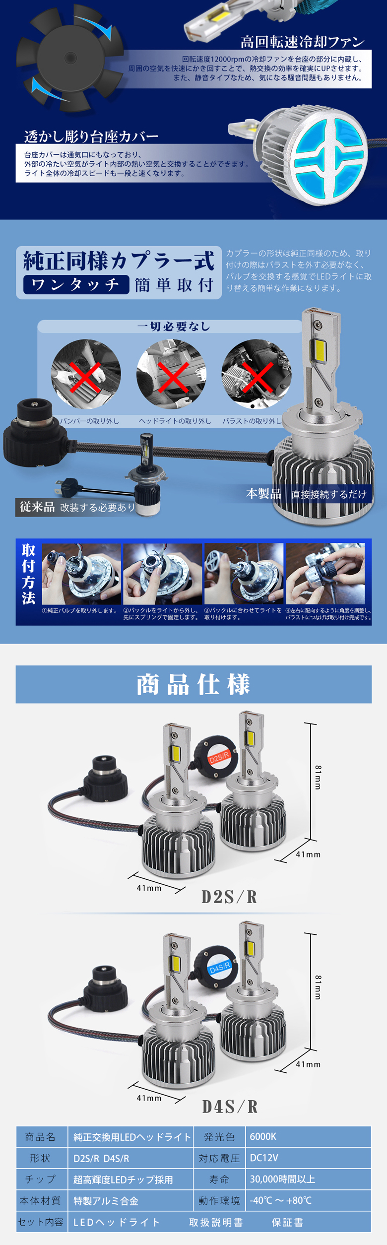 Original Japanese name: | LEDヘッドライト D2S D2R 兼用 純正交換用 12800lm HIDより明るい 12V 6000K 超高輝度 車検対応 360°光軸調整 五重放熱システム LED化 2個 |