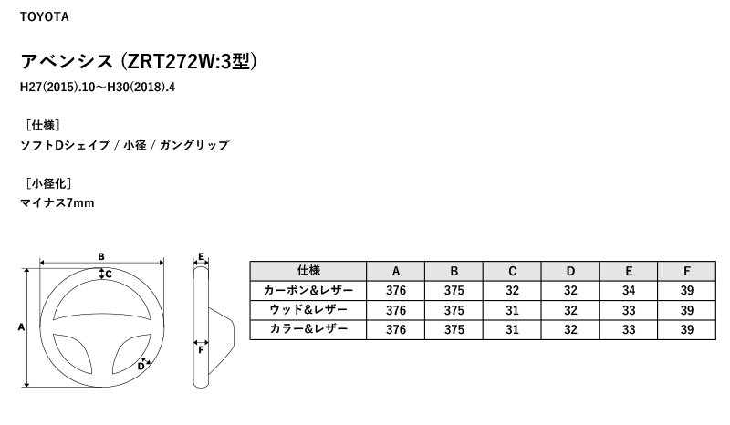 Original Japanese name: | [REAL]ZRT272W アベンシス(H27/10~H30/4_3型)用レアルステアリング_ウッド(ブラックステッチ)[オリジナルシリーズ] |