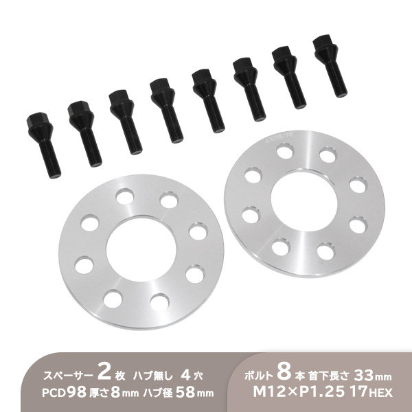 ю スペーサー 2枚 [ 4穴 PCD98 ハブ径 58mm 8mm厚 ハブ無 ]& ボルト 8本 [ M12×P1.25 17HEX 60度テーパー 首下33mm ブラック ] セット