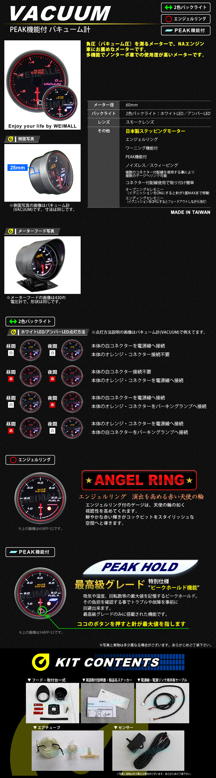 AUTO GAUGE/JAPAN STEPPER MOTOR MOVEMENT 60mm バキューム計 エンジェルリング/ピークホールド機能付 |