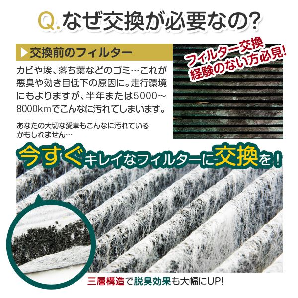 車の場合は外気を吸いやすいのでホコリや花粉、ディーゼル粉等を浄化する必要がございます。