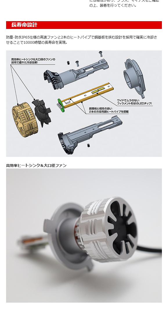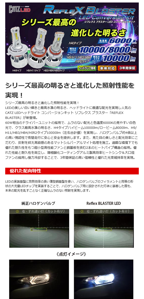 ■商品説明 | シリーズ最高の明るさと進化した照射性能を実現!LEDの美しい白い輝きと最高水準の明るさ、ヘッドライトに最適な配光を実現し人気のCATZ LEDヘッドライト コンバージョンキット リフレクス ブラスター「REFLEX BLASTER」が新登場。60W相当のドライバーユニットの採用で、ムラのない配光と色温度6000Kの見やすい白色光で、クラス最高水準の明るさ、H4タイプハイビーム10000lm/ロービーム8000lm、H9/H11/HB3/HB4/HIR2タイプ10000lm(左右合計値)を実現し、ハロゲンバルブ約4倍以上の高い視認性で夜間走行に安心と安全を提供します。また、見た目の美しさと配光効率にこだわり、反射を抑え高級感のあるマットシルバーアルマイト処理を施工。過酷な環境下でも優れた耐久性をもつ超小型高性能ファンと銅基板を挟む2本のヒートパイプ構造の採用。優れた性能と耐久性を両立し、陽極酸化コーティングアルミ製高効率ヒートシンク&大口径ファンの採用し強力冷却することで、3年間保証の高い信頼性と優れた光束維持率を実現。優れた配向特性LEDの実装基盤に放熱効率の良い薄型銅基盤を使い、ハロゲンバルブのフィラメントと同等の形状の大光量LEDチップを実装することで、ハロゲンバルブ用に設計された灯体に装着した際も、本来の配光を乱すことなく正確なムラのない照射を実現します。高出力ドライバーユニットをセパレート化バルブ本体から独立したドライバーユニットをセパレート化の採用で、熱を発生するドライバーユニットをバルブ本体から独立させることにより、LEDチップの性能を最大限に発揮させる構造を採用し、圧倒的な明るさを実現。アイドリングストップ車/ハイブリッド/電気自動車対応 ※12V車専用設計アイドリングストップ車や電圧の変化しやすいハイブリッド車でも使用可能。簡単取付け(シングルタイプ)バルブフランジを付け替えることにより、H9/H11 又は HB3/HB4/HIR2のバルブタイプに対応できます。また、バルブフランジを回転させることでLEDの発光面の調整が出来るので、配光調整も可能です。 ※電源端子には極性があり、プラス、マイナスをご確認の上、装着を行ってください。長寿命設計防塵・防水IP65仕様の高速ファンと2本のヒートパイプで銅基板を挟む設計を採用で確実に冷却させることで10000時間の長寿命を実現。 |