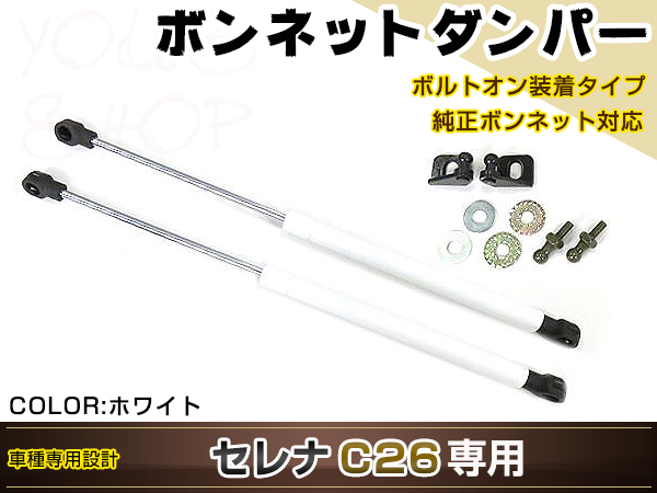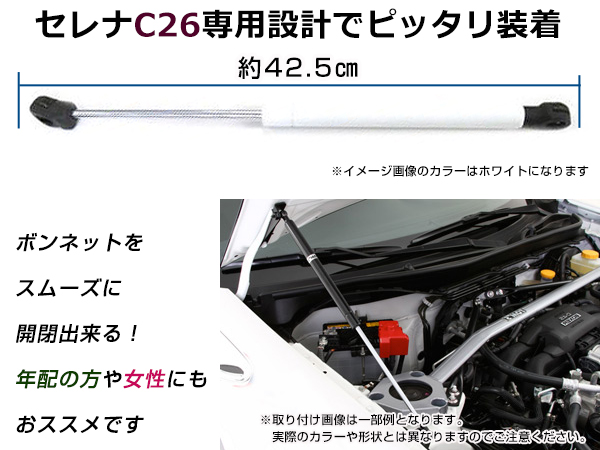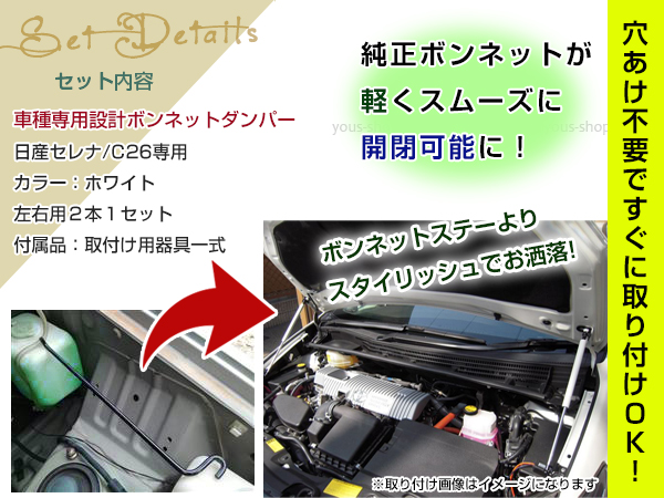 Original Japanese name: | セレナ C26 H22/12~ 高級車仕様 ボンネットダンパー ショック エンジン フード 開閉 安全対策 落下防止 左右セット ホワイト |