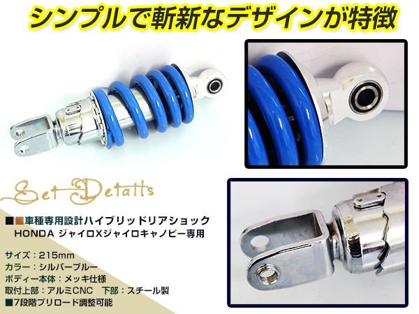 Original Japanese name: | リア サスペンション ジャイロX ジャイロキャノピー 215mm 青/銀 |