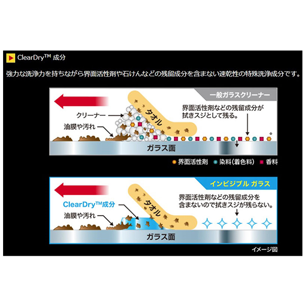 ●独自のClearDry成分が油膜や頑固な汚れをすばやく取り除き、ギラつきのない驚くほどきれいなガラスに仕上げるガラス用洗浄剤です。