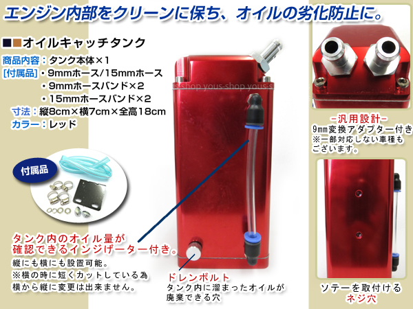 Original Japanese name: | アルミ製 オイルキャッチタンク ホース付 角型 赤 ジムニー etc |