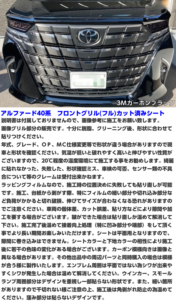 Original Japanese name: | 【N-STYLE】アルファード40系 フロントグリル(フル)カット済シート 3Mシート使用カーボン柄等 カラー選択 キズ防止カスタム |