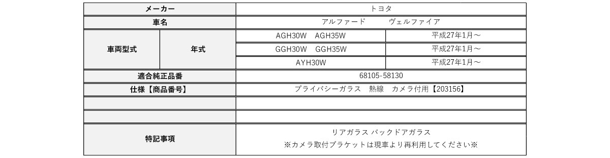 Original Japanese name: | 5◇新品◇リアガラス リヤガラス◇アルファード AGH30W AGH35W GGH30W GGH35W AYH30W プライバシーガラス 熱線 カメラ付用 203156 |