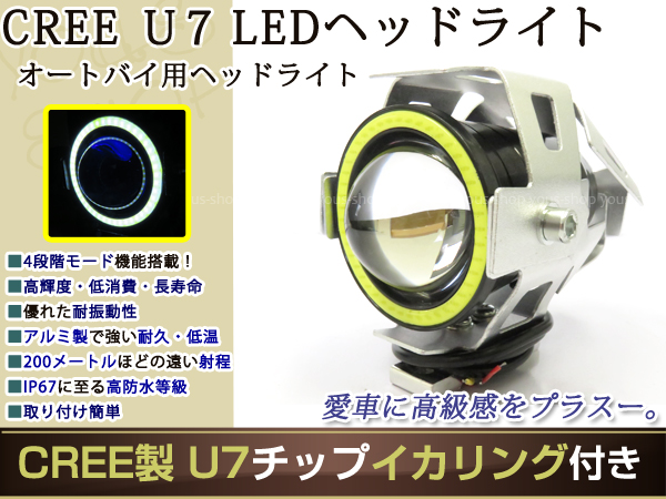 砲弾型バイク用 CREE製 高輝度U7チップ LED ヘッドライト/フォグ 銀 イカリング付 Hi/Low 15w 3000ml ストロボ機能付 取付金具付 1個