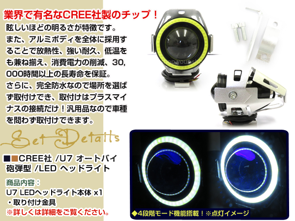 Original Japanese name: | 砲弾型バイク用 CREE製 高輝度U7チップ LED ヘッドライト/フォグ 銀 イカリング付 Hi/Low 15w 3000ml ストロボ機能付 取付金具付 1個 |