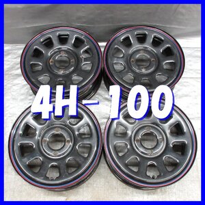 □送料無料 A2■ ブラックスチール ■ 14×5J+42 ■ 4H PCD100 ■ 中古ホイール 4本 ※レッド&ブルーラインあり 2ピース/ディ