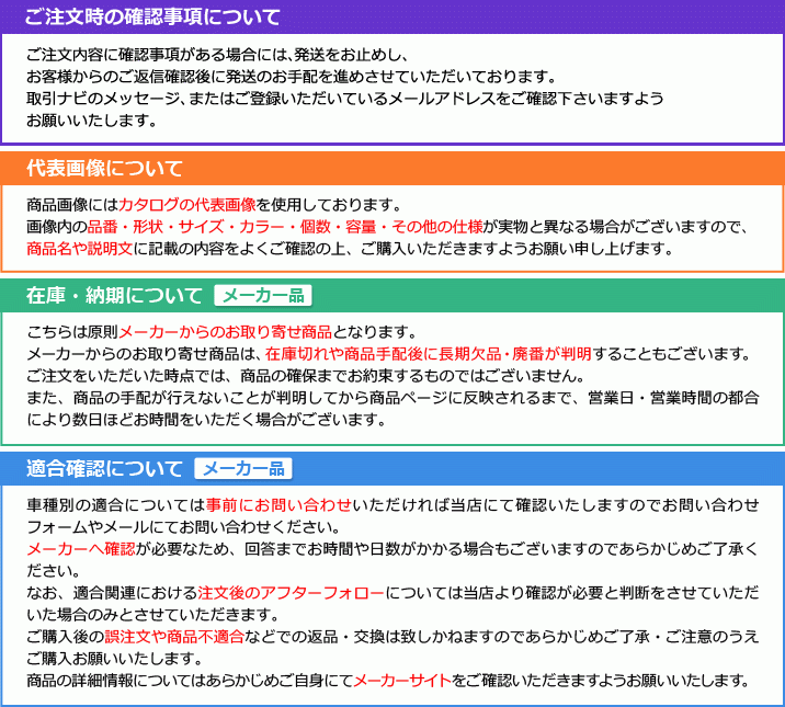 なお、適合関連における注文後のアフターフォローについては当店より確認が必要と判断をさせていただいた場合のみとさせていただきます。