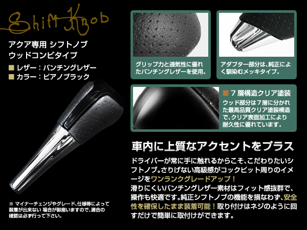 Original Japanese name: | アクア NHP10系 ステアリング シフトノブ ピアノブラック レザー |