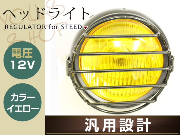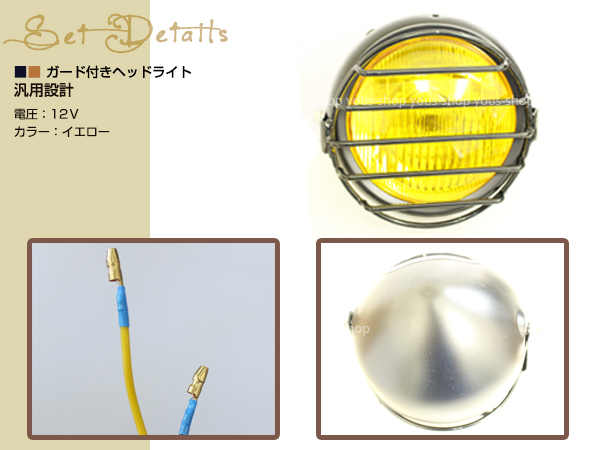 Original Japanese name: | 12V ヘッドライト ビンテージ ボバー ガード付き オフロード 5.5インチ ブラック イエローレンズ ハロゲン球 愛車のカスタムに |