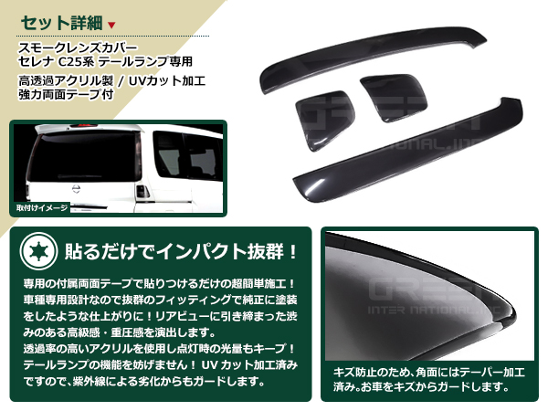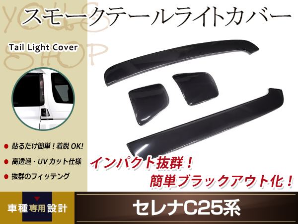 セレナ C25系 スモーク テールランプカバーセット レンズカバー 左右セット 4P 取り付け用両面テープ付属 ドレスアップ カスタムパーツ
