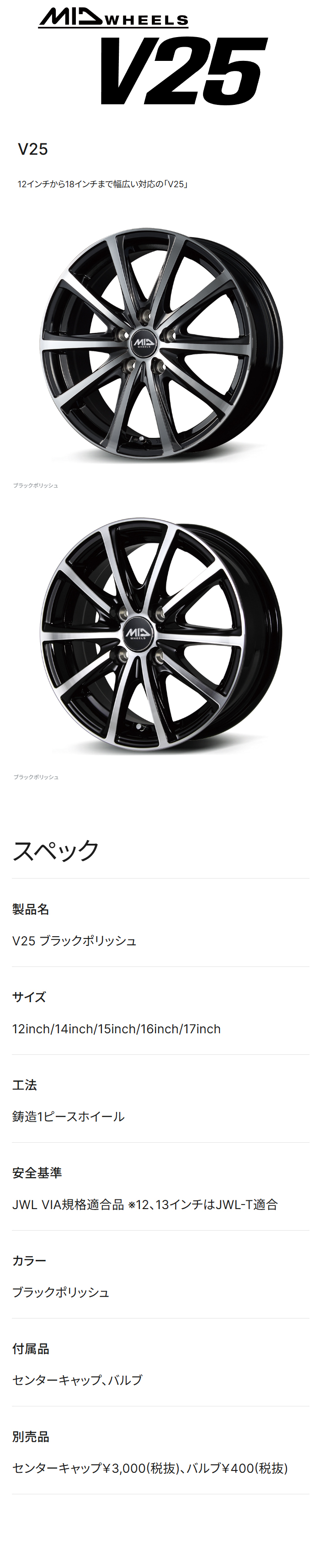 Original Japanese name: | MID WHEELS V25 アルミホイール4本セット 13x4.0J 4H PCD100 +43 (ブイニーゴー ブラックポリッシュ) |
