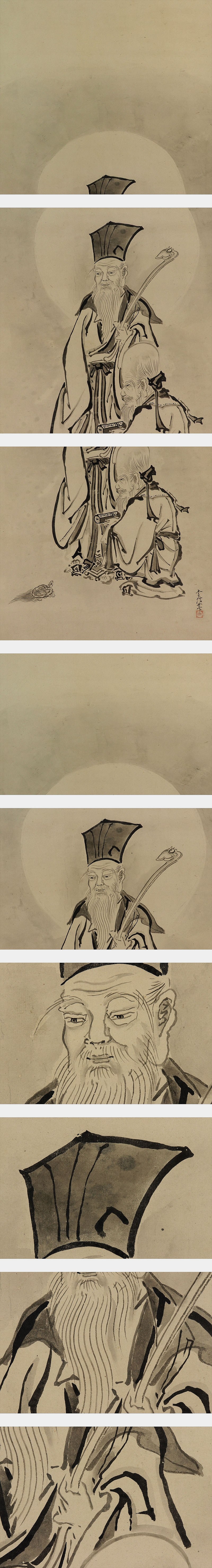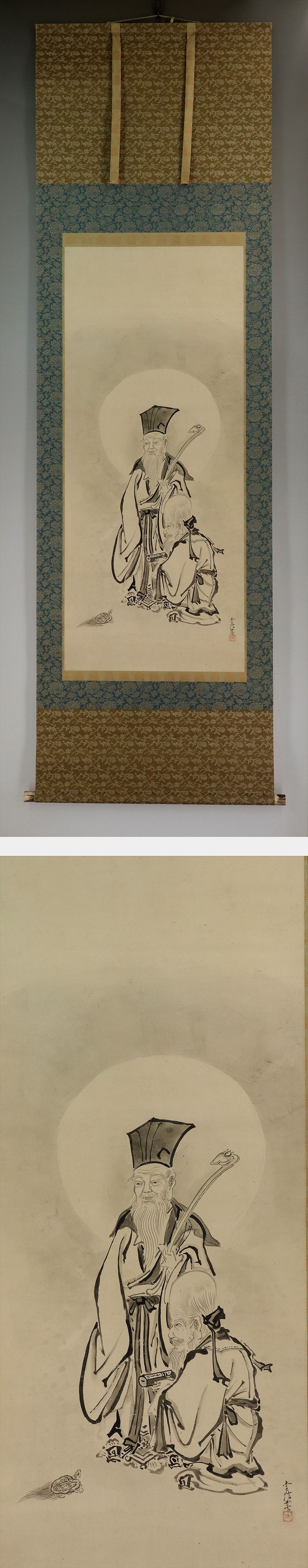 狩野常信 かのう-つねのぶ(1636-1713) 江戸時代前期-中期の画家。 寛永13年3月13日生まれ。狩野尚信の長男。慶安3年(1650)父の跡を継ぐ。 御所障壁画制作に参加し,宝永年間には狩野派の最高指導者として紫宸殿の「賢聖障子」を描く。 宝永6年法印。木挽町狩野家隆盛の基礎を固めた。正徳3年1月27日死去。78歳。 京都出身。通称は右近。号は養朴,古川叟。 本紙は、染み、汚れ、折れ、皺、虫食があります。 表装は、染み、薄汚れ、皺、虫食、軸先に汚れがあります。 【サイズ】 作品 横約50.5cm×縦約119cm 表装 横約66cm×縦約217cm |