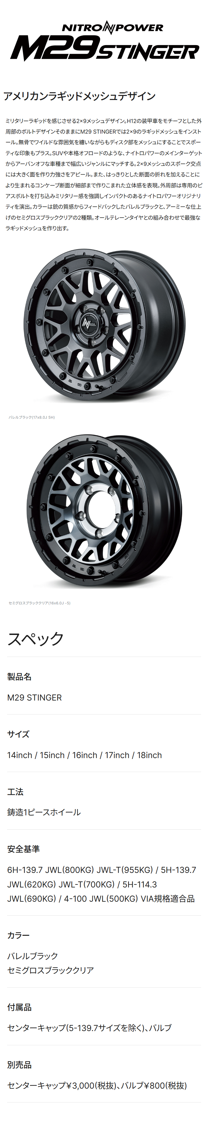Original Japanese name: | MID NITRO POWER M29 STINGER アルミホイール4本セット 17x8.0J 6H PCD139.7 +20 (エムニーキュースティンガー セミグロスブラッククリア |