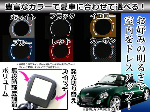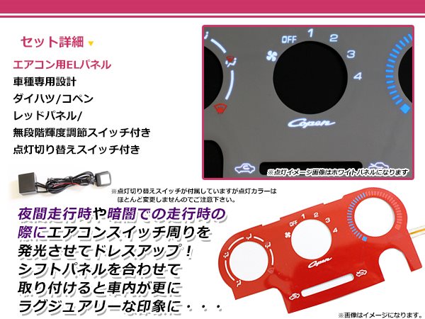Original Japanese name: | インバーター付き パネルカラー レッド 赤 L880K コペン ELエアコンパネル 4出力 2色発光 切替スイッチ付き 光量調整可能 |