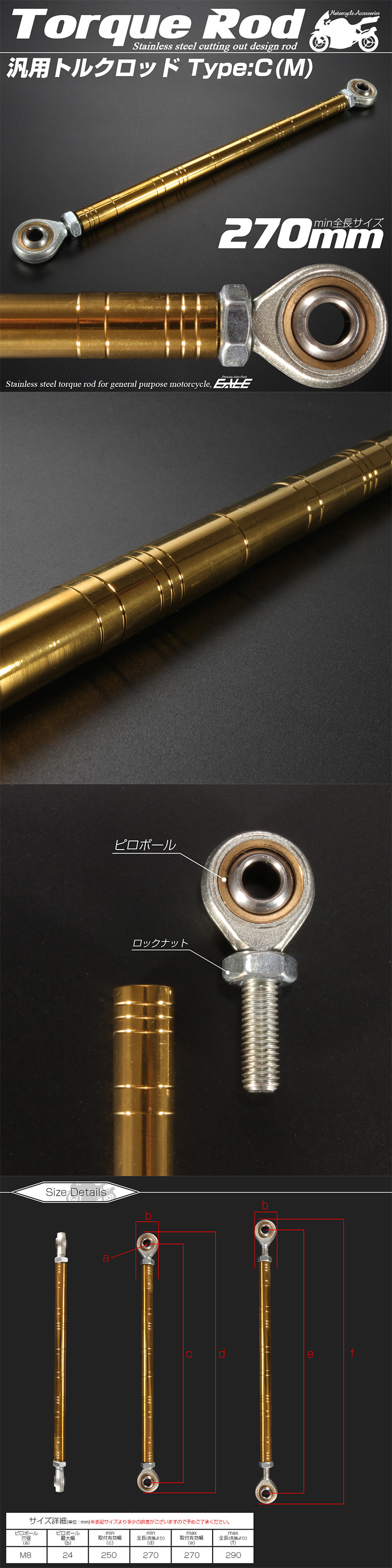Original Japanese name: | 汎用 ブレーキ トルクロッド Mサイズ 取付幅250-270mm カラー ゴールド タイプC ターンバックル ピロボール TH0092 |