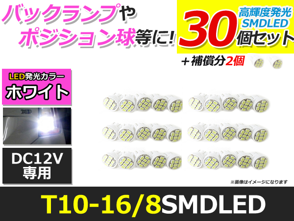 メール便送料無料 高輝度 LED T10/T16 SMD 8連 30個 +2保証 ホワイト 白 ポジション バックランプ ナンバー灯 ライセンス バニティ