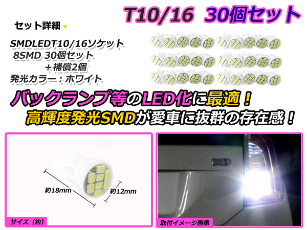 Original Japanese name: | メール便送料無料 高輝度 LED T10/T16 SMD 8連 30個 +2保証 ホワイト 白 ポジション バックランプ ナンバー灯 ライセンス バニティ |