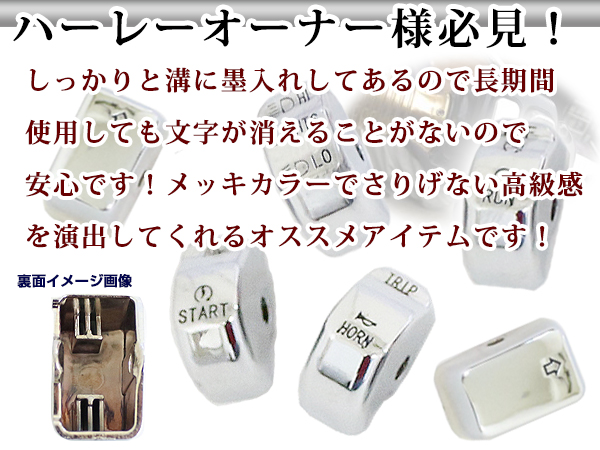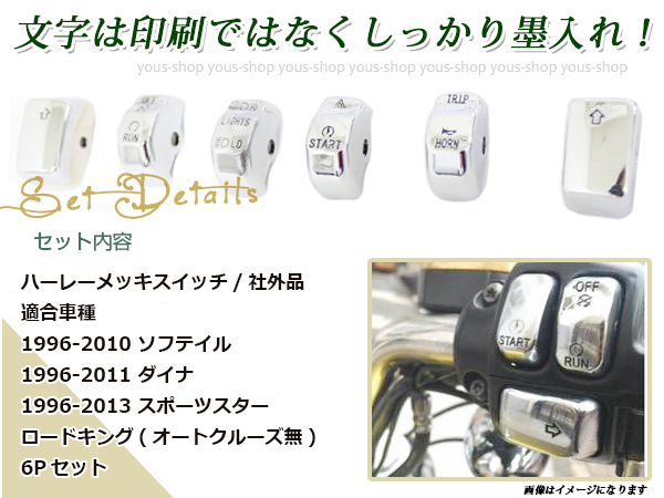Original Japanese name: | ハーレー メッキスイッチカバー 6ピースセット ダイナ ソフテイル XL ロードキング 制御スイッチボタンキャップ スイッチボタンカバー |