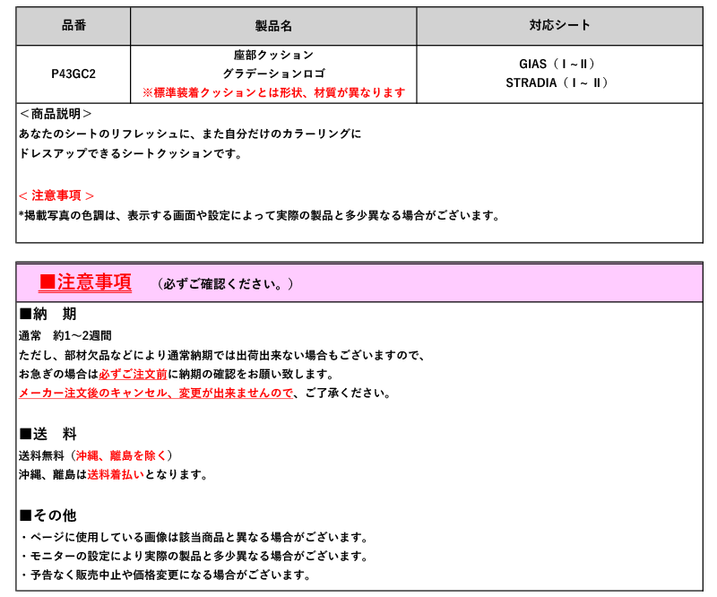 Original Japanese name: | [BRIDE]GIAS1/2(ガイアス1/2),STRADIA1/2(ストラディア1/2)用座部クッション(グラデーションロゴ)[P43GC2] |