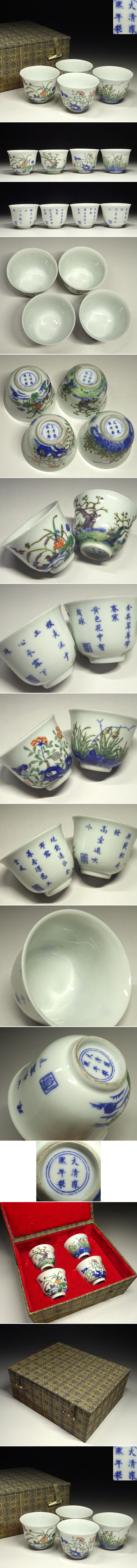 緑屋h■ 中国古玩 粉彩 煎茶碗 杯 4点 四季花漢詩 大清康熙年 箱付 唐物 時代物 i9/10-6115/17-2#80