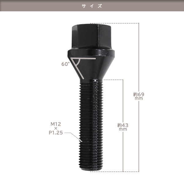 Original Japanese name: | ю 【メール便】 ラグボルト [ M12×P1.25 17HEX 60度テーパー 首下:43mm ブラック ][ 1本 ] スチール製 ホイールボルト 輸入車 |
