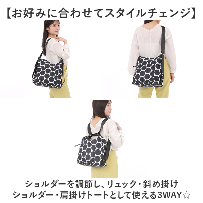 サイズ | [縦]約33cm/[横(底部)]約33cm/[マチ]約15cm [持ち手]約35cm/[ショルダー斜め掛け]最長約71cm(調節可能) [ショルダー両肩掛け]最長約106cm(調節可能) ※サイズは当店計測の実寸サイズです。実際の商品ならびにメーカー表記サイズとは多少の誤差が生じる場合がございます。あらかじめご了承ください。 |