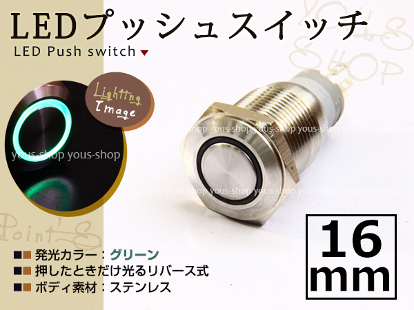 Original Japanese name: | 埋込式モーメンタリ リング プッシュスイッチ イルミ 16mm 緑 LEDリング ステンレスボディ 表面防滴仕様 イルミ 12V |