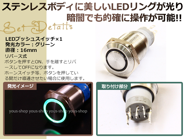 埋込式モーメンタリ リング プッシュスイッチ イルミ 16mm 緑 LEDリング ステンレスボディ 表面防滴仕様 イルミ 12V