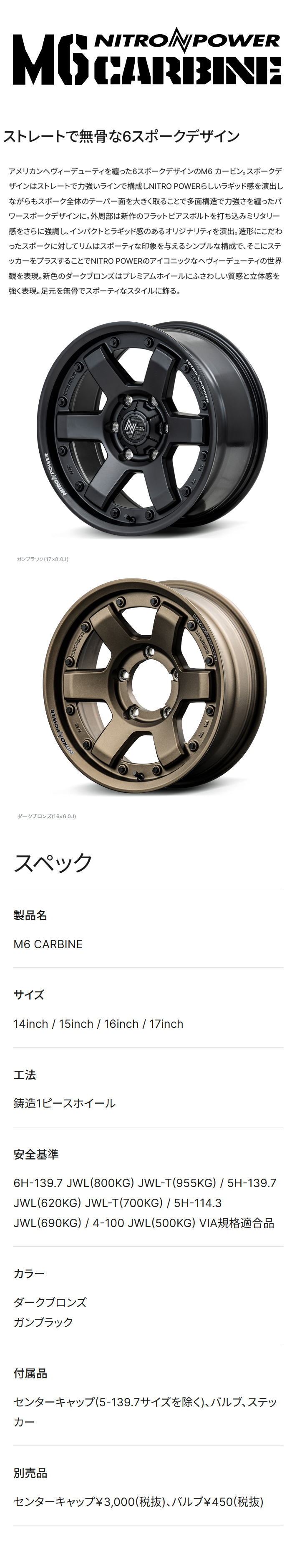 Original Japanese name: | MID NITRO POWER M6 CARBINE アルミホイール4本セット 17x8.0J 6H PCD139.7 +20 (エムロクカービン GBK ガンブラック) ナイトロパワー |