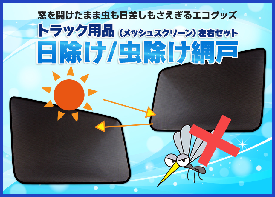 ■商品説明 | トラックの窓ガラス枠にはめ込むだけで、窓を開けた状態でも虫をシャットアウトできるメッシュスクリーンです。 エアコンをかけずに、自然の風を感じることができ、車中泊や仮眠・休憩に最適! エンジンを切って使用することで、燃料代の節約もできるのでとても省エネ・エコです。 使用しないときはコンパクトに収納できます。 2枚組です。 |