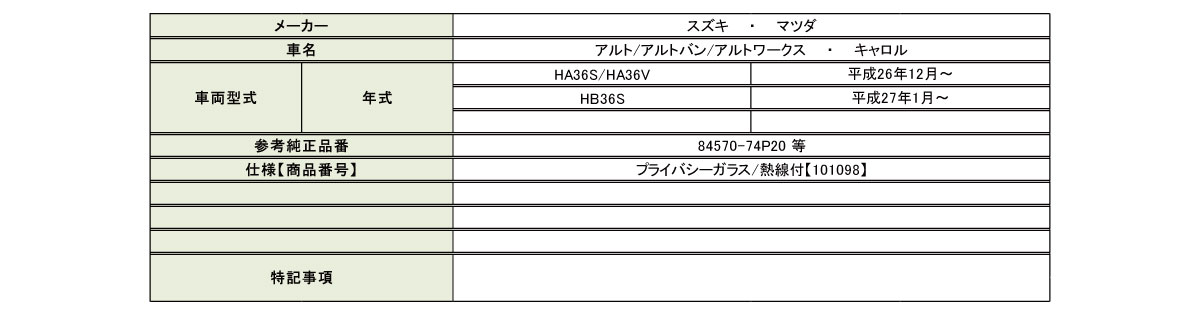 5◇新品◇リアガラス リヤガラス バックドアガラス◇スズキ アルト アルトワークス HA36S HA36V プライバシーガラス 熱線付 101098