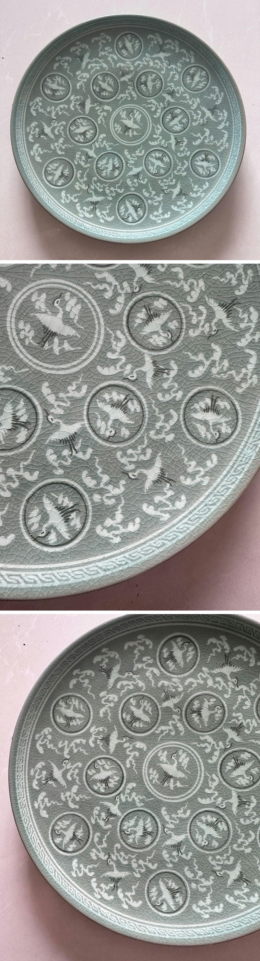 ▼渡鶴羽▼R9661コレクター放出 朝鮮古陶 朝鮮古美術 高麗磁 古高麗 李朝 高麗磁官窯青磁団鶴紋盤